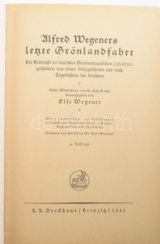 Wegener, Else: Alfred Wegeners letzte Grönlandfahrt. Die Erlebnisse der deutschen Grönlandexpedition 1930/1931 geschildert von seinen Reisegefährten und nach Tagebüchern des Forschers. Leipzig, 1943, F. A. Brockhaus, 303+[1] p.+ 25 t.+ 1 (kihajtható) t. Fekete-fehér képekkel illusztrálva. Német nyelven. Kiadói kartonált papírkötés, jó állapotban.