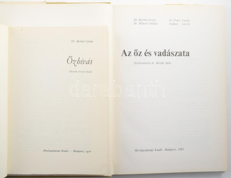 Leírás: Az őz és vadászata. Szerk.: Dr. Berdár Béla. Bp., 1983, Mezőgazdasági, 174 p. Fekete-fehér illusztrációkkal. Kiadói egészvászon kötés, szakadt kiadói papír védőborítóban. + Bertóti István: Őzhívás. Bp., 1976, Mezőgazdasági, 243 p. Fekete-fehér fotókkal illusztrált. Kiadói papírkötés, jó állapotban.