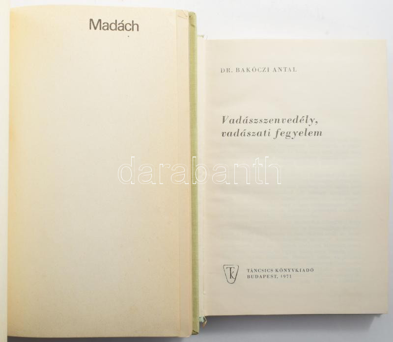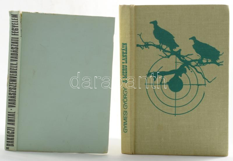 Bakóczi Antal: Vadászszenvedély, vadászati fegyelem. Csergezán Pál illusztrációival. Bp., 1971, Táncsics. Kiadói kartonált papÃrkötés, sérült gerinccel. + Gyimesi György: A Meru lankáin. Vadászélmények. Pozsony,1975,Madách. Kiadói egészvászon-kötés.