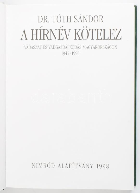Dr. Tóth Sándor: A hírnév kötelez. Vadászat és vadgazdálkodás Magyarországon 1945-1990. 1998, Nimród Alapítvány. Kiadói kartonált kötés, jó állapotban.