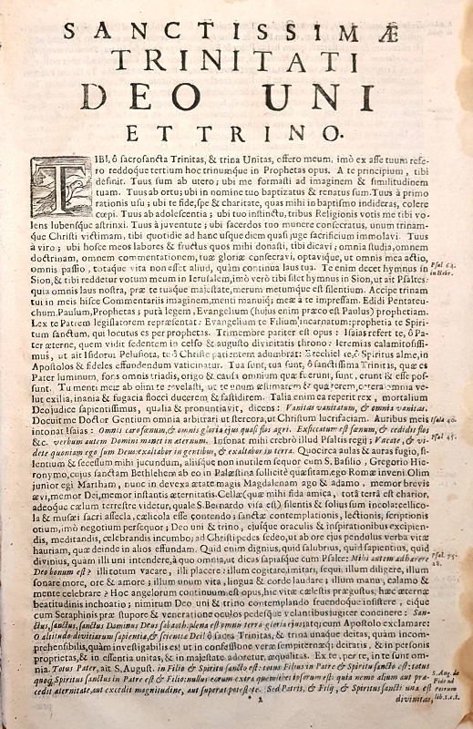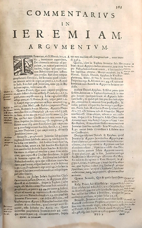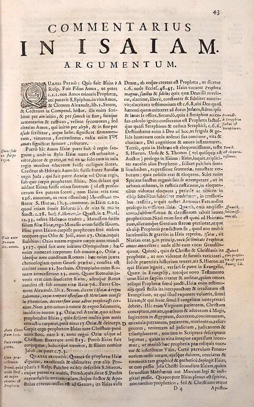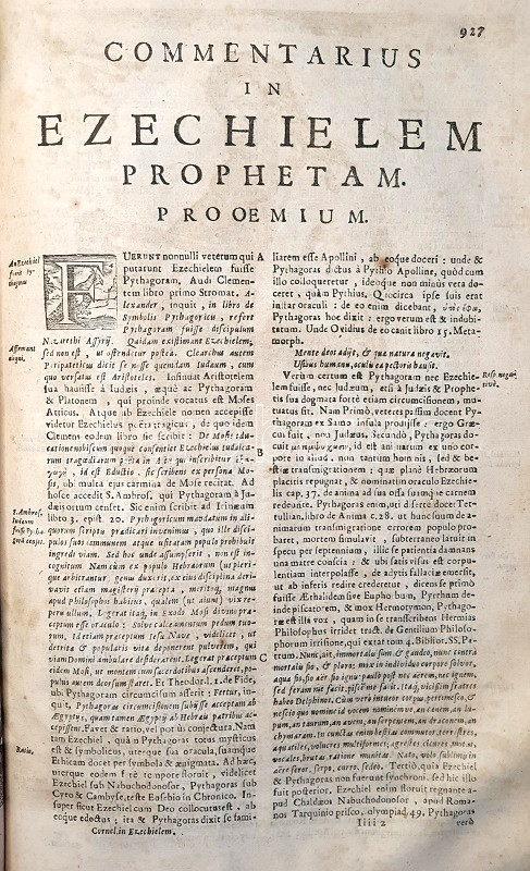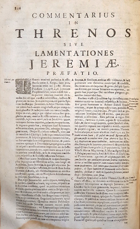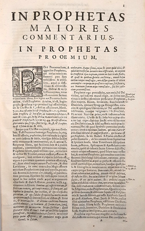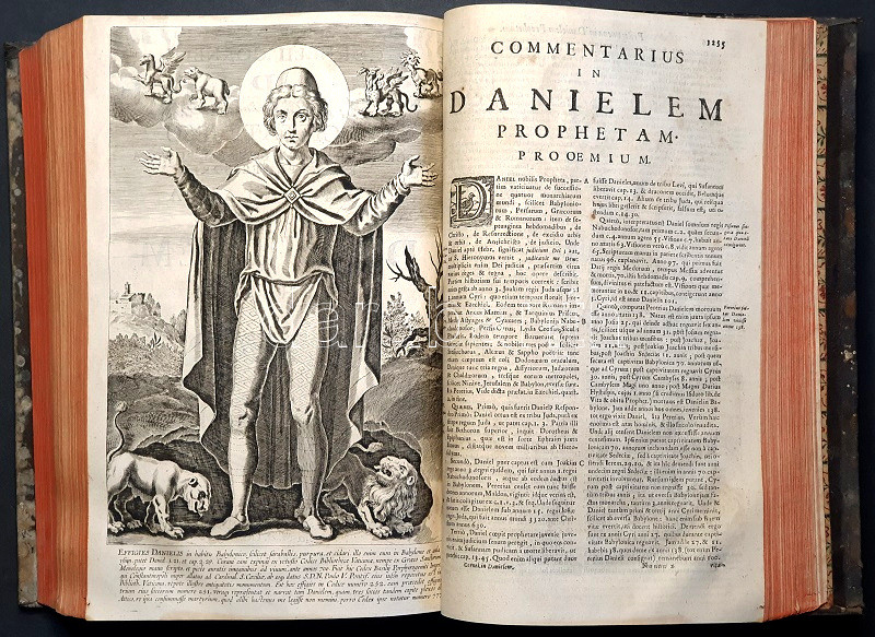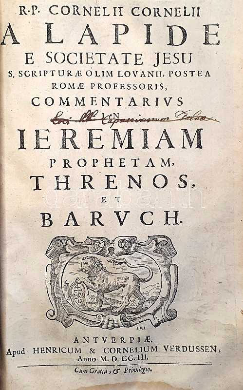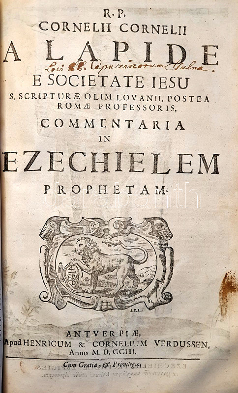 Példányunkból hiányzik a munka rézmetszetű díszcímlapja. Cornelius a Lapide (1567-1637) flamand jezsuita szerzetes, bibliatudós, exegéta, a Leuveni Egyetem teológiaprofesszora. Tudós munkássága során - Jób könyve és a Zsoltárok kivételével - elkészítette a teljes katolikus Szentírás jezsuita szemléletű bibliamagyarázatát, amely a Biblia szövegét történelmi és teológiai kontextusba helyezi. A nagy próféták könyveiről, Ézsaiás, Jeremiás, Ezékiel és Dániel próféta könyveiről írt szentírás-magyarázatai először 1621-ben jelentek meg, külön-külön kötetekben. Példányunk az 1681-1714 között megjelenő, első teljes jezsuita bibliakommentár-folyam részeként megjelenő gyűjteményes kiadásból való, mely címlapja megjegyzése szerint "Postrema editio aucta et recognita", azaz javított, bővített és végső formába öntött kiadásnak számít.