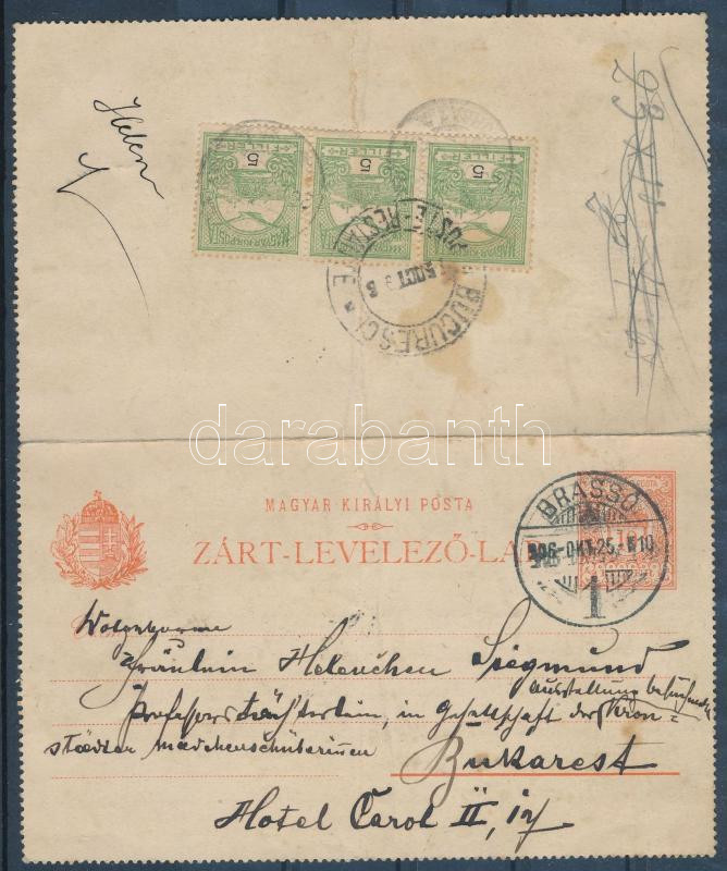 1906 Díjjegyes zárt levelezőlap Brassóból Bukarestbe, ott 3 x Turul 5f...