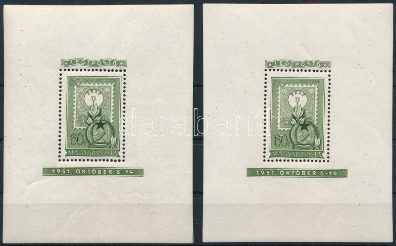 1951 80 éves a magyar bélyeg 60f blokk látványosan félre vágva, bal oldalon 23, jobb oldalon 28 mm blokkszéllel + jó minőségű támpéldány (34.000++) / Mi block 20 with faulty cutting