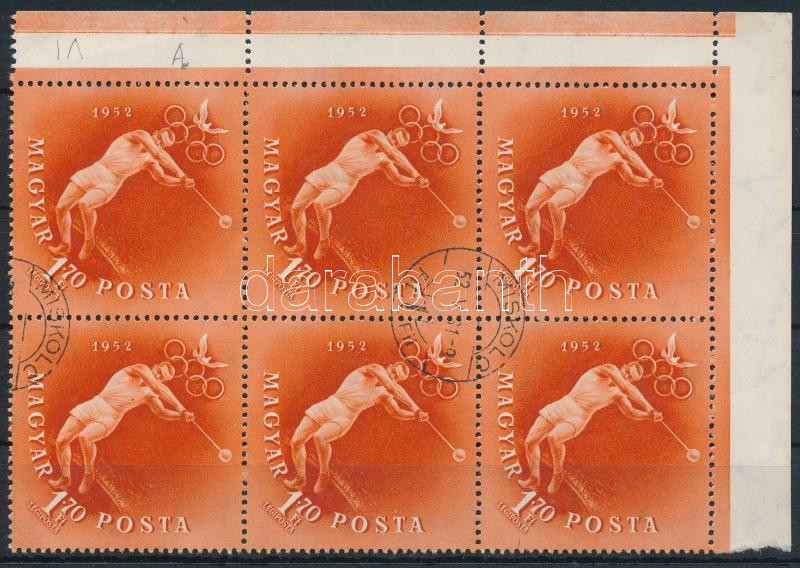 1952 Olimpia I. - Helsinki 1,70Ft ívsarki hatostömb az "A" betű szárán folt lemezhibával, a lemezhibás bélyeg számvízjellel. Legfeljebb 1-2 példány létezhet!