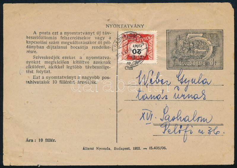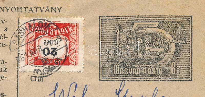 1961 8f Nyomtatvány 20f portóval / PS-printed matter with 20f postage ... https://www.darabanth.com/hu/514-Filatelia-kepeslap-numizmatika-mutargy-konyv-papirregiseg-ekszer-aukcio/515.0/Magyar-filatelia-es-postatortenet/1957-1969-kozotti-kiadasok~59/1961-8f-Nyomtatvany-20f-portoval-PS-printed-matter-with-20f-postage-due~II3427196