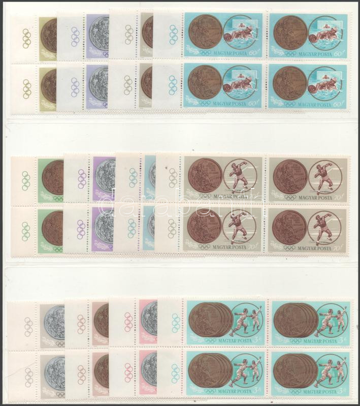 1965 Olimpiai érmesek (I.) - Tokió sor 4-es tömbökben bal oldali ötkar... https://www.darabanth.com/hu/514-Filatelia-kepeslap-numizmatika-mutargy-konyv-papirregiseg-ekszer-aukcio/515.0/Magyar-filatelia-es-postatortenet/1957-1969-kozotti-kiadasok~59/1965-Olimpiai-ermesek-I-Tokio-sor-4-es-tombokben-bal-oldali-otkarikas-ivszellel~II3423673