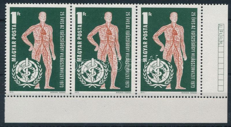Leírás: 1973 Egészségügyi világszervezet ívsarki hármascsík, ívszélen nyomdai jelzés