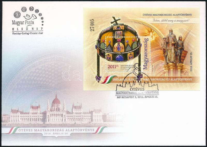 2016 Ötéves Magyarország alaptörvénye blokk FDC-n (25.000) https://www.darabanth.com/hu/514-Filatelia-kepeslap-numizmatika-mutargy-konyv-papirregiseg-ekszer-aukcio/515.0/Magyar-filatelia-es-postatortenet/2010-2019-kozotti-kiadasok~65/2016-Oteves-Magyarorszag-alaptorvenye-blokk-FDC-n-25000~II3479890