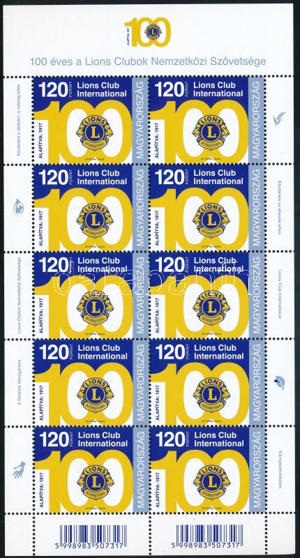 Leírás: 2017 100 éves a Lions Clubok Nemzetközi Szövetsége kisív