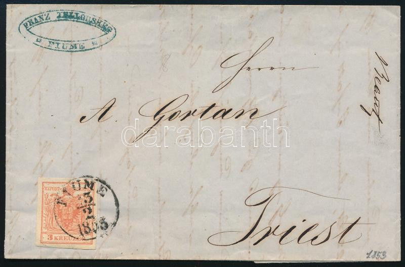 1853 3kr HP III "FIUME 1853" - piros "TRIESTE" https://www.darabanth.com/hu/514-Filatelia-kepeslap-numizmatika-mutargy-konyv-papirregiseg-ekszer-aukcio/515.0/Magyar-filatelia-es-postatortenet/Az-1850-es-kiadas~18/1853-3kr-HP-III-FIUME-1853-piros-TRIESTE~II3483209
