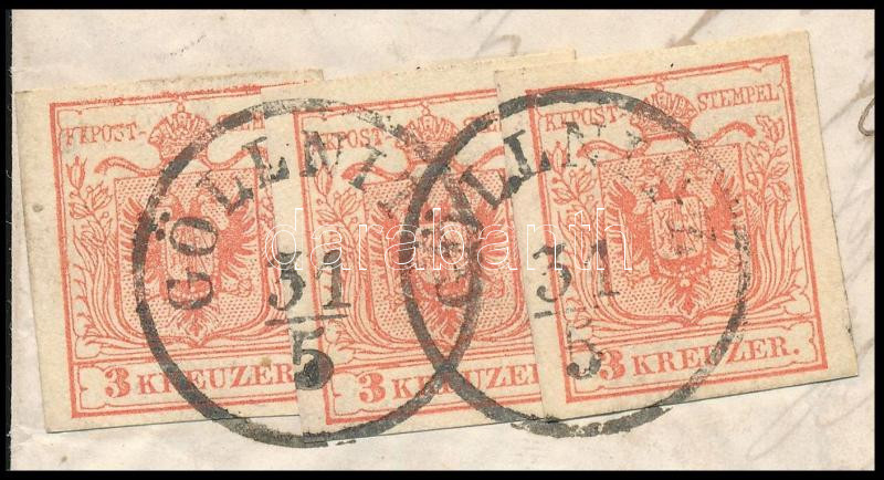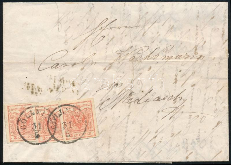 Leírás: 1855 3 x 3kr látványos lépcsős bérmentesítés teljes tartalmú levélen "GÖLLNITZ" - Mediasch