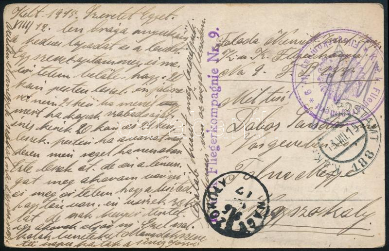 1915 Képeslap / Postcard "K.u.k. Fliegerkompagnie Nr. 9." + ... https://www.darabanth.com/hu/514-Filatelia-kepeslap-numizmatika-mutargy-konyv-papirregiseg-ekszer-aukcio/515.0/Magyar-filatelia-es-postatortenet/I-Vilaghaborus-osztrak-magyar-tabori-posta-Legiero~46/1915-Kepeslap-Postcard-Kuk-Fliegerkompagnie-Nr-9-plus-EP-188-Nagyszokoly~II3447462