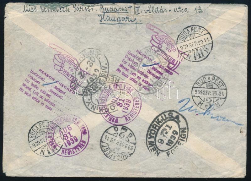 1939. júl. 11. Légi levél 1,70P bérmentesítéssel az USA-ba, hosszas cím keresés, cím meg nem találás után visszaküldve Magyarországra (1939. szept. 29.) Ritka! / Airmail cover to the USA, returned