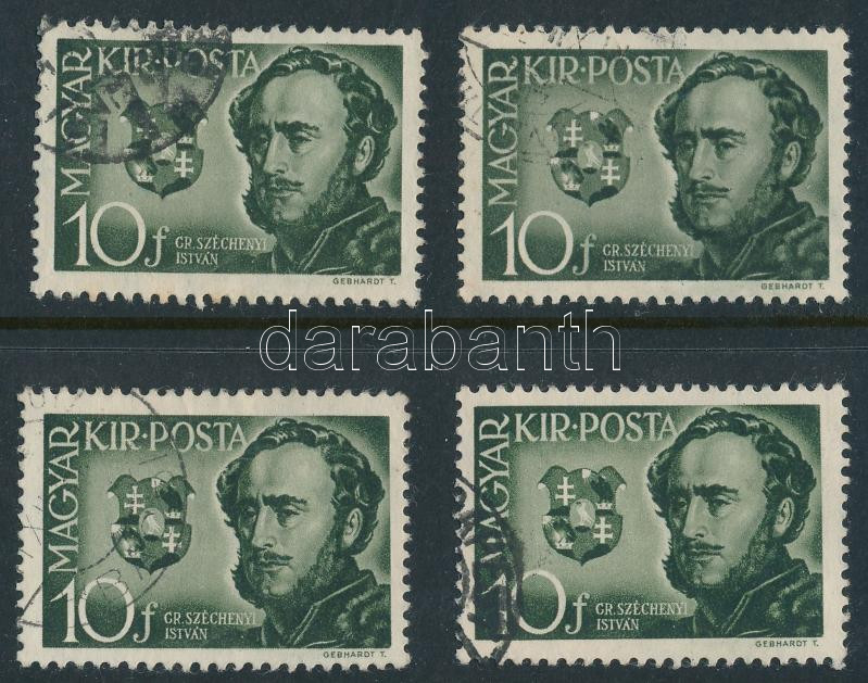 Leírás: 1941 Gróf Széchenyi István (I.) 4 db 10f "fehér hasú holló" lemezhibával (10.000)