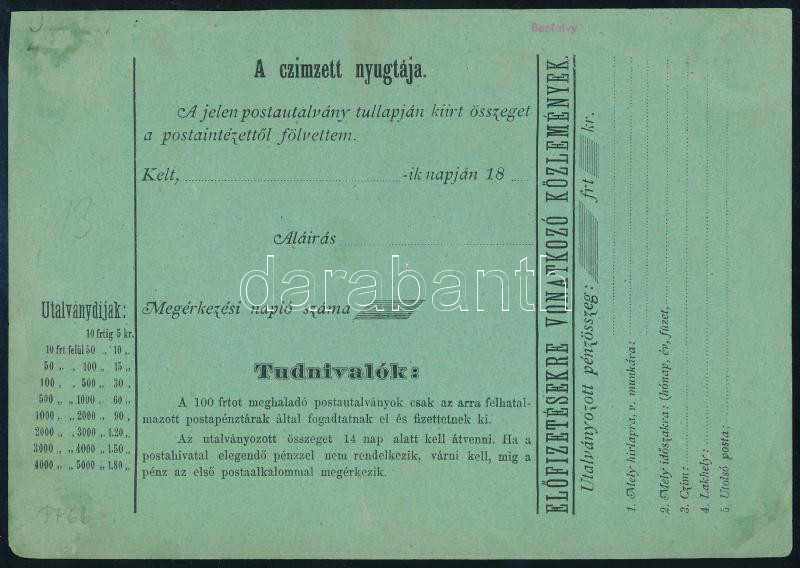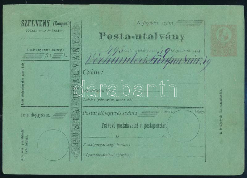 Leírás: 1871 5kr díjjegyes Postautalvány kitöltve, de nem került felhasználásra