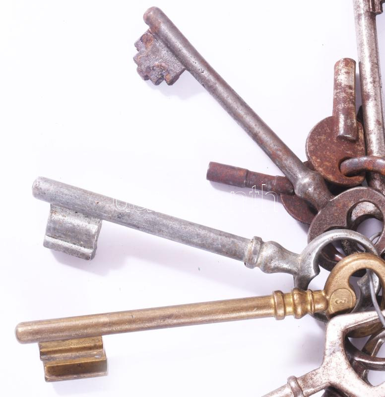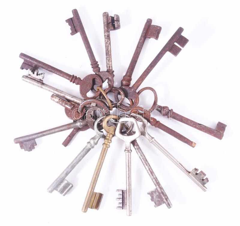 Leírás: 17 darab antik kulcs, közte réz, h: 11 cm alatt