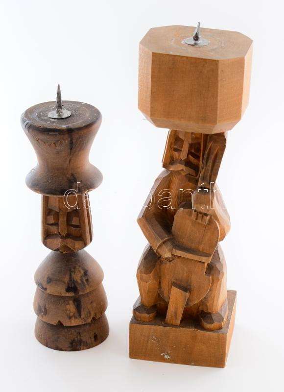 Leírás: 2 darab erdélyi faragott fa gyertyatartó, m: 21 cm
