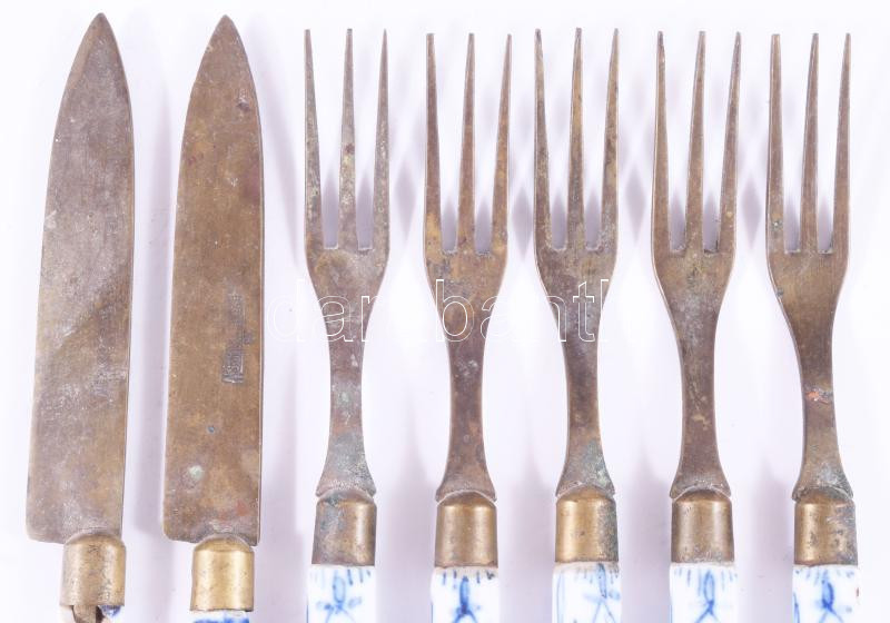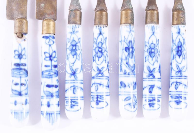 Leírás: Antik kobaltkék virágmintás festésű 7 darabos villa és kés szett, h: 15 cm alatt
