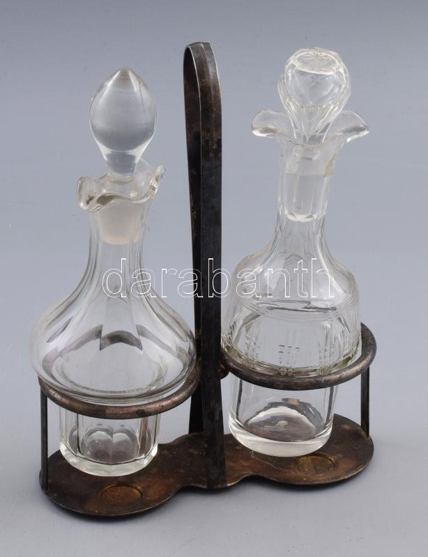 Leírás: Antik olajecet kínáló 2 klf dugós üveggel, m: 21,5 cm