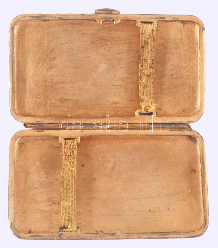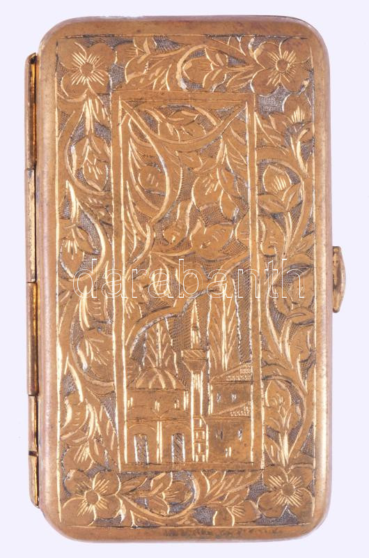 Leírás: Aranyozott réz gravírozott cigarettatárca, 5x8 cm