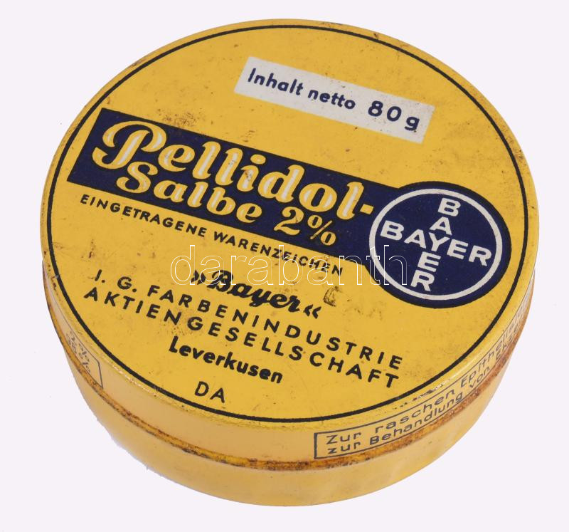 Bayer Pellidol-Salbe fémdoboz, tartalommal, d: 8 cm https://www.darabanth.com/hu/514-Filatelia-kepeslap-numizmatika-mutargy-konyv-papirregiseg-ekszer-aukcio/515.0/Mutargy-papirregiseg-egyeb/Bolhapiac~92/Bayer-Pellidol-Salbe-femdoboz-tartalommal-d-8-cm~II3459284