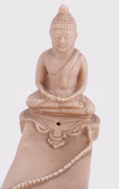Leírás: Buddha figurával díszített füstölőtartó, műgyanta, h: 29 cm