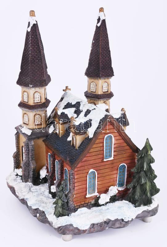 Leírás: Elemmel működő világító és zenélő karácsonyi templom asztaldísz, használatlan, eredeti dobozában, m: 26 cm