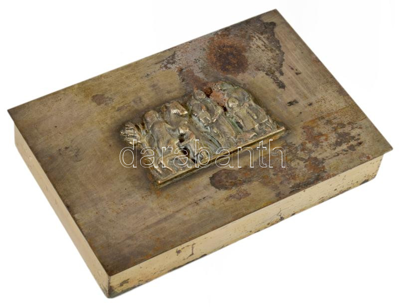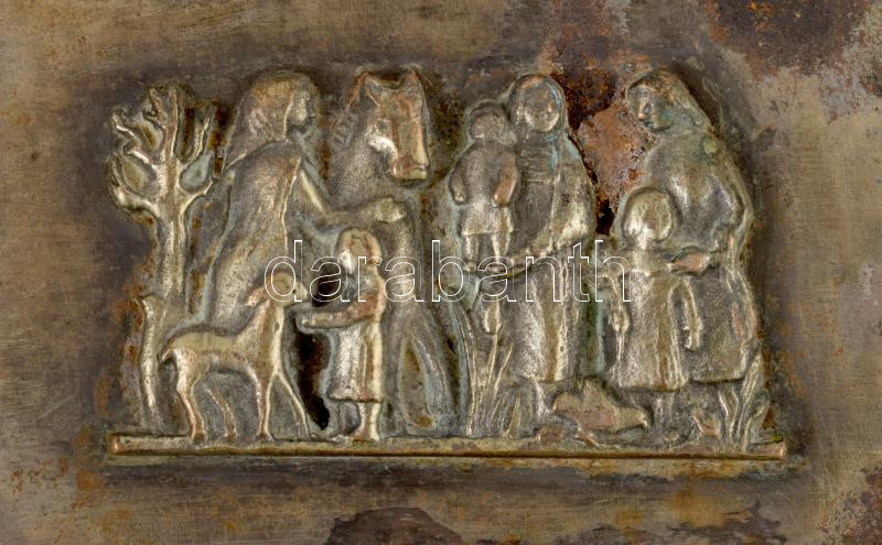 Leírás: Iparművész díszdoboz, fabetétes, bibliai jelenettel, kopott, 10x15 cm