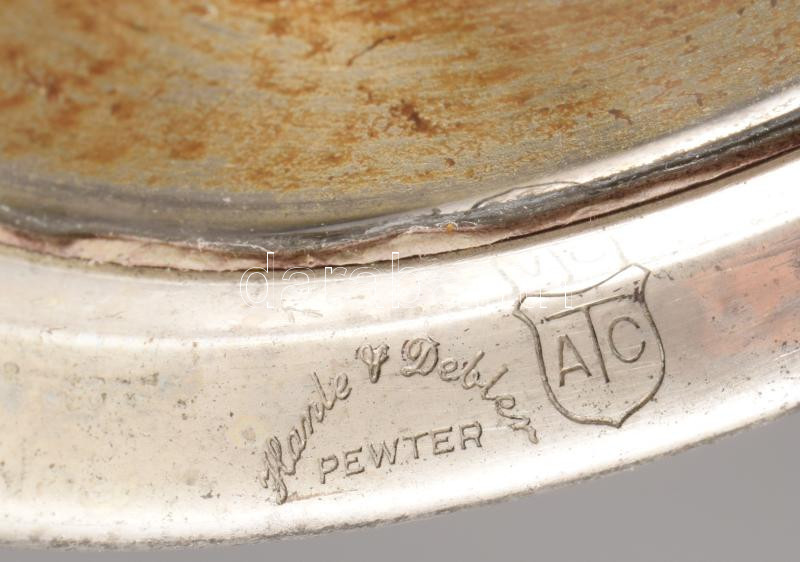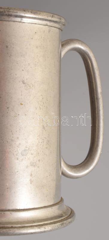 Leírás: Jelzett ón korsó, üveg aljjal, m: 12 cm