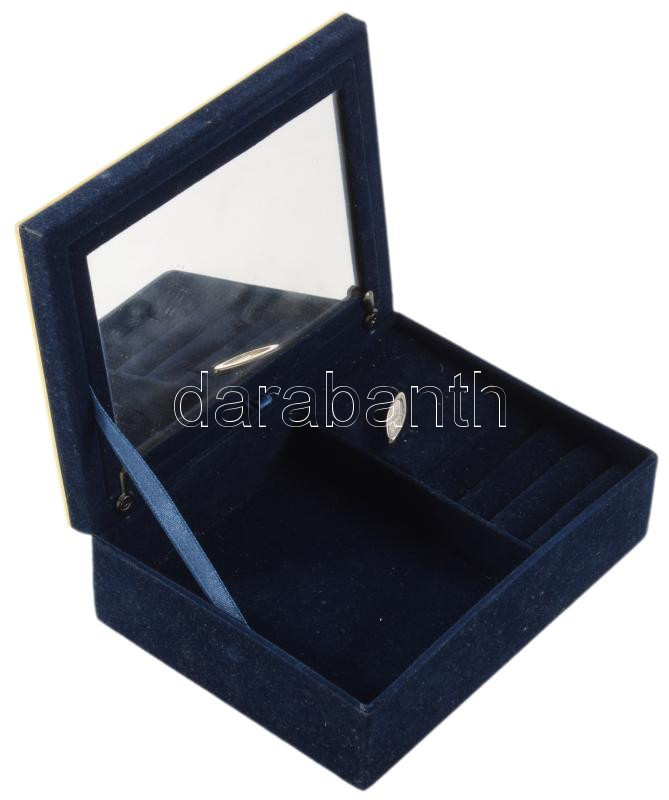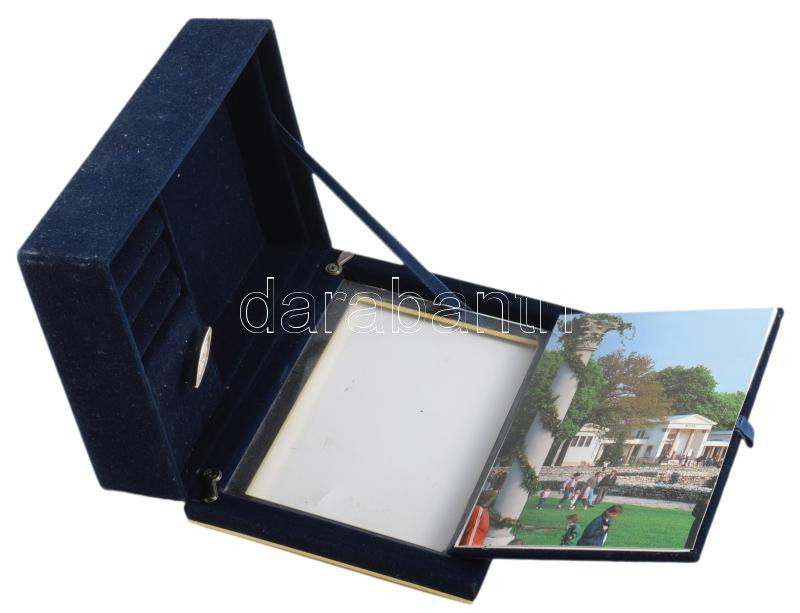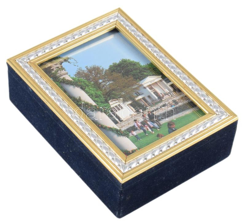 Leírás: Kék bársony bevonatú ékszerdoboz, cserélhető képpel a tetején, 11x15 cm