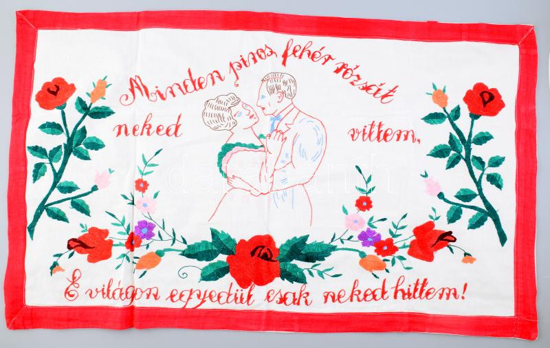 Kézzel hímzett konyhai falvédő, "Minden piros fehér rózsát neked ... https://www.darabanth.com/hu/514-Filatelia-kepeslap-numizmatika-mutargy-konyv-papirregiseg-ekszer-aukcio/515.0/Mutargy-papirregiseg-egyeb/Bolhapiac~92/Kezzel-himzett-konyhai-falvedo-Minden-piros-feher-rozsat-neked-vittem-E-vilagon-egyedul-~II3457389