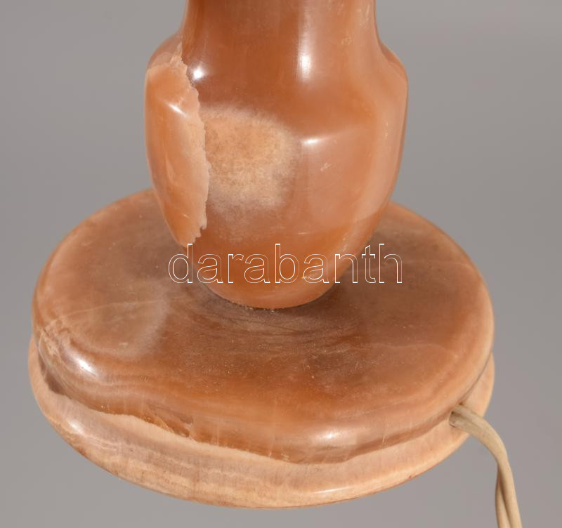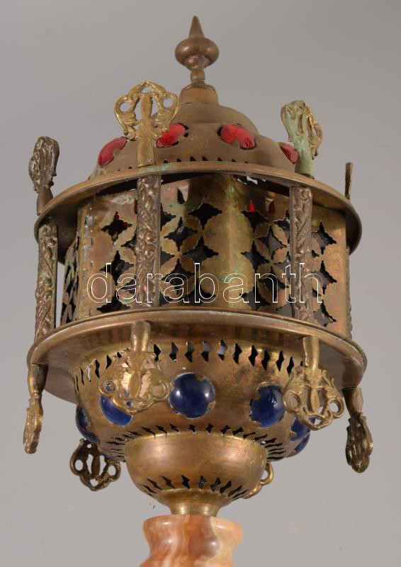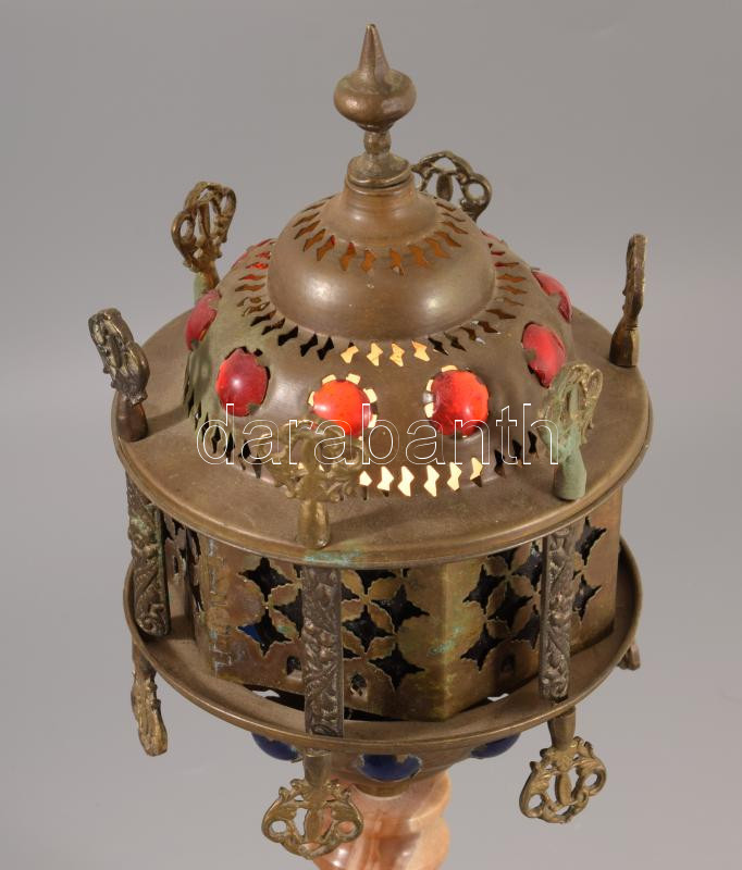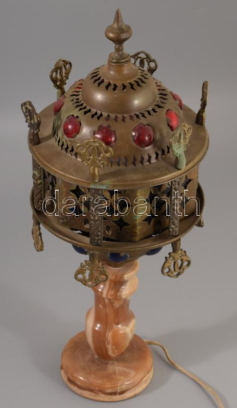 Leírás: Ónix talpú keleti réz lámpa, díszes, berakásokkal, m: 39 cm