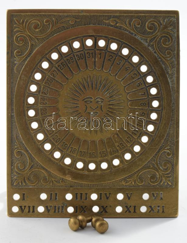 Réz öröknaptár, 2 jelölőjével, m: 13,5 cm https://www.darabanth.com/hu/514-Filatelia-kepeslap-numizmatika-mutargy-konyv-papirregiseg-ekszer-aukcio/515.0/Mutargy-papirregiseg-egyeb/Bolhapiac~92/Rez-oroknaptar-2-jelolojevel-m-13-5-cm~II3480699