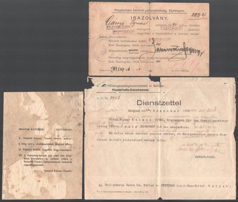 Leírás: ca 1916-1918 4 db katonai okmány, benne a Nemzeti Katonatanács röplapja