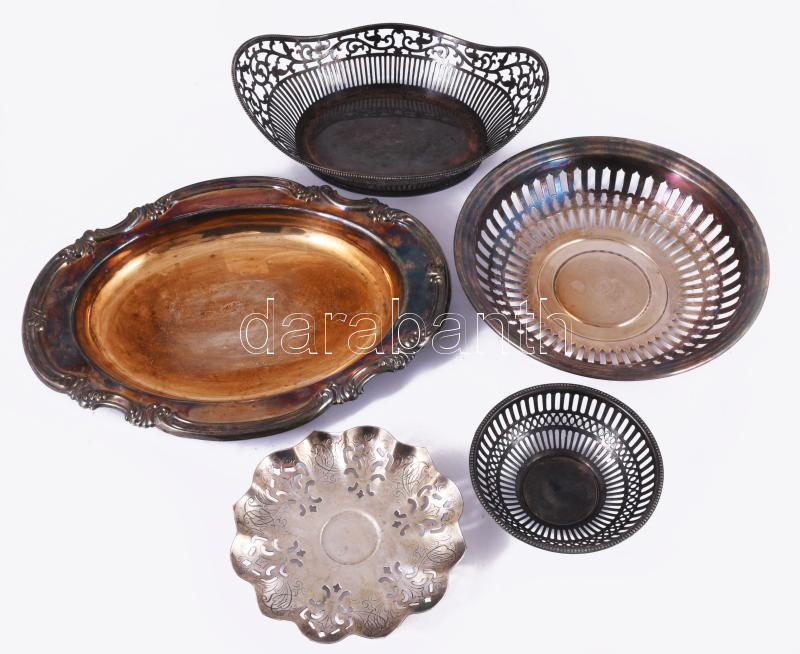 Leírás: 5 db klf ezüstözött tálka, áttört, régi darabokkal 12-32 cm ig