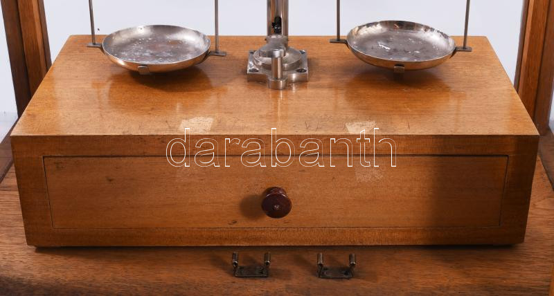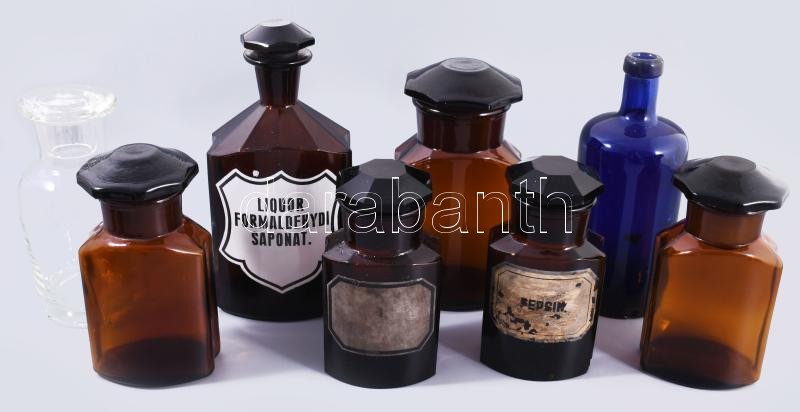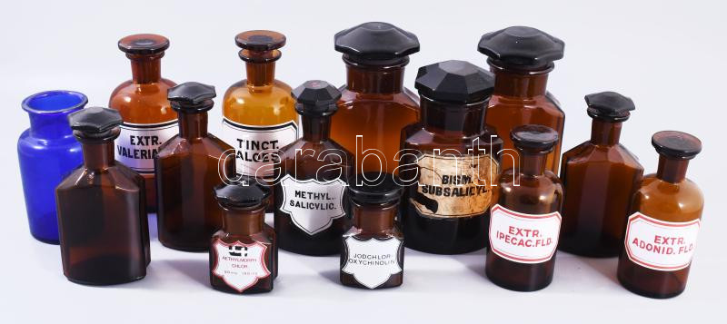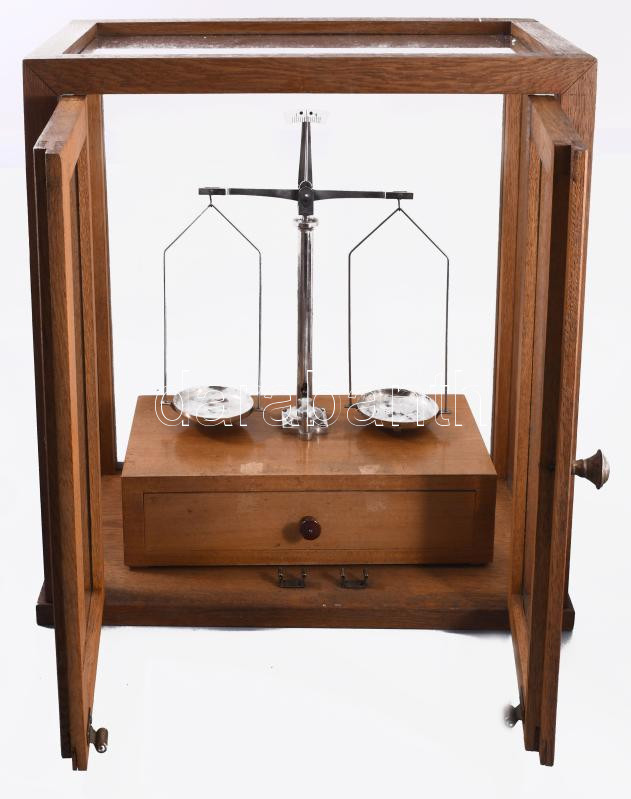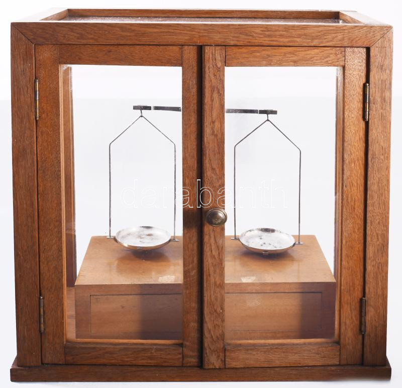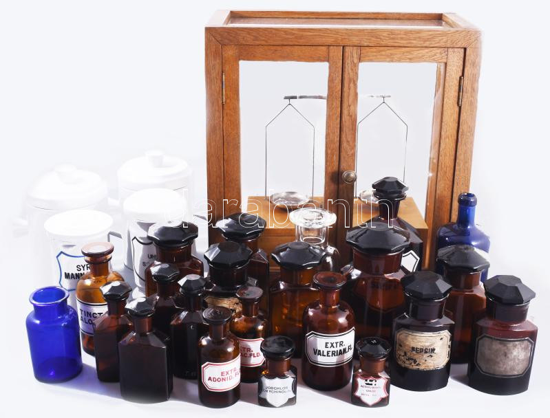 cca 1850-1950 Patika hagyaték. Patikai mérleg üvegezett oldalú ajtós vitrinben 42x40x22 cm, fiókjában mérlegsúlyok. Hozzá különböző korszakokból 25 darab patikai üveg és tégely, közte 2-3 sérült darabbal. /// ca. 1850-1950 Pharmacy estate. Pharmacy balance in a glazed-door cabinet (42×40×22 cm), with balance weights in the drawer. Together with 25 pharmacy bottles and jars from different periods, including 2-3 damaged pieces. /// KIZÁRÓLAG SZEMÉLYES ÁTVÉTEL, NEM POSTÁZZUK! / ONLY PERSONAL COLLECTION AT OUR OFFICE!