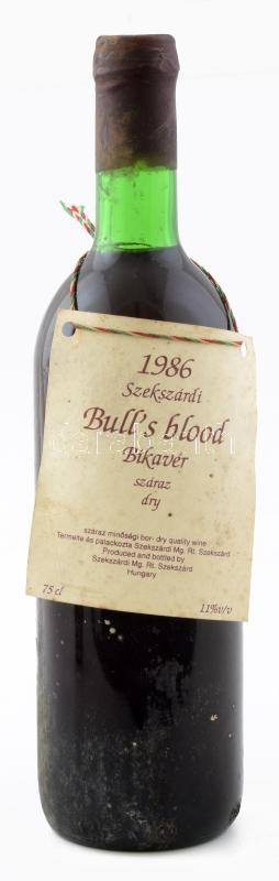 Leírás: 1986 Szekszárdi Bull's Blood, Bikavér, bontatlan palack száraz vörösbor, címke nélkül, foltos palackkal, 11%, 0,75l.