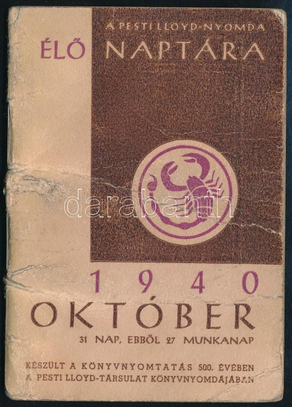 1940 A Pesti Lloyd-Nyomda élő naptára, zsebnaptár, használt, viseltes ... https://www.darabanth.com/hu/514-Filatelia-kepeslap-numizmatika-mutargy-konyv-papirregiseg-ekszer-aukcio/515.0/Mutargy-papirregiseg-egyeb/Nyomtatvanyok~83/1940-A-Pesti-Lloyd-Nyomda-elo-naptara-zsebnaptar-hasznalt-viseltes-allapotban~II3099108