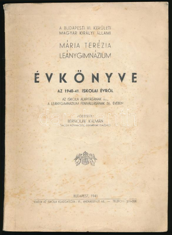 1941 A budapesti VI. kerületi magyar királyi állami Mária Terézia leánygimnázium évkönyve az 1940-41. iskolai évről. Bp., 1941, Hunnia-ny., 69+[3] p.+ 3 t. Kiadói papírkötés, foltos borítóval.