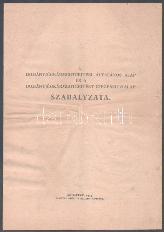 1943 A Dohányjégkármegtérítési általános alap és a dohányjégkármegtérí... https://www.darabanth.com/hu/514-Filatelia-kepeslap-numizmatika-mutargy-konyv-papirregiseg-ekszer-aukcio/515.0/Mutargy-papirregiseg-egyeb/Nyomtatvanyok~83/1943-A-Dohanyjegkarmegteritesi-altalanos-alap-es-a-dohanyjegkarmegteritest-kiegeszi~II3374894