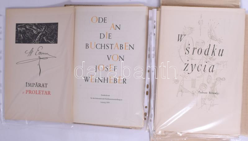 Leírás: 1959 Internationale Buchkunstaustellung Leipzig mappa, benne német, román, lengyel, kínai, angol és héber nyelvű különnyomatokkal