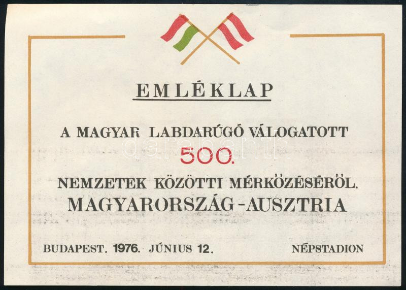Leírás: 1976 Emléklap a Magyar labdarúgó válogatott 500. nemzetek közötti mérkőzéséről, Magyarország-Ausztria 14x10 cm