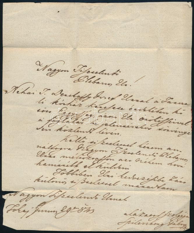 Leírás: 1843 Tokaj, Spielberg Gábor saját kézzel írt levele