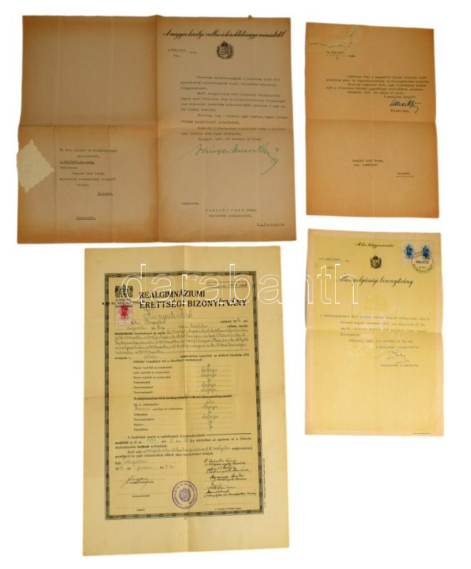 Leírás: 1937-1947 Hunyadi Jenő 4 db okmánya, közte kinevezés Szinyei-Mersei Jenő (1888-1957) vallás- és közoktatásügyi miniszter aláírásával