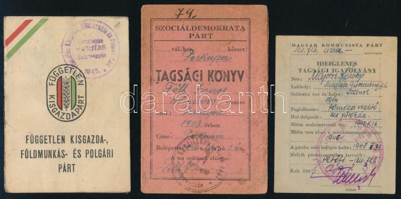 1946-1949 Szociáldemokrata Párt (SZDP) és Független Kisgazdapárt (FKgP) tagsági könyvek, bélyegekkel + Magyar Kommunista Párt (MKP) ideiglenes tagsági igazolvány