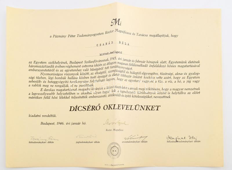 1946 Bp., a Pázmány Péter Tudományegyetem Rector Magnificusa és Tanácsa által kiállított dicsérő oklevél Csanád Béla hittudomány szakos hallgató részére, aki Budapest ostroma alatt ,,önfeláldozó hősies magatartásával emberszeretetéről és az egyetemhez való hűségéről tett tanúbizonyságot"; Moór Gyula (1888-1950) jogtudós, politikus, országgyűlési képviselő, az MTA ideiglenes elnöke, az egyetem rektora; Ibrányi Ferenc (1901-1983) katolikus pap, teológus, a hittudományi kar dékánja; Szandtner Pál (1884-1963) jogász, a jogtudományi kar dékánja; Kiss Ferenc, az orvostudományi kar dékánja; ill. Hajnal István, a bölcsészettudományi kar dékánjának aláírásával. Hajtva, 34,5x24,5 cm