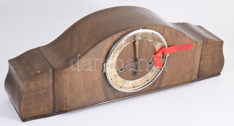 Leírás: Régi német kandallóóra, jelzett szerkezettel, számlapvédő üveg hiányzik, 59x21 cm