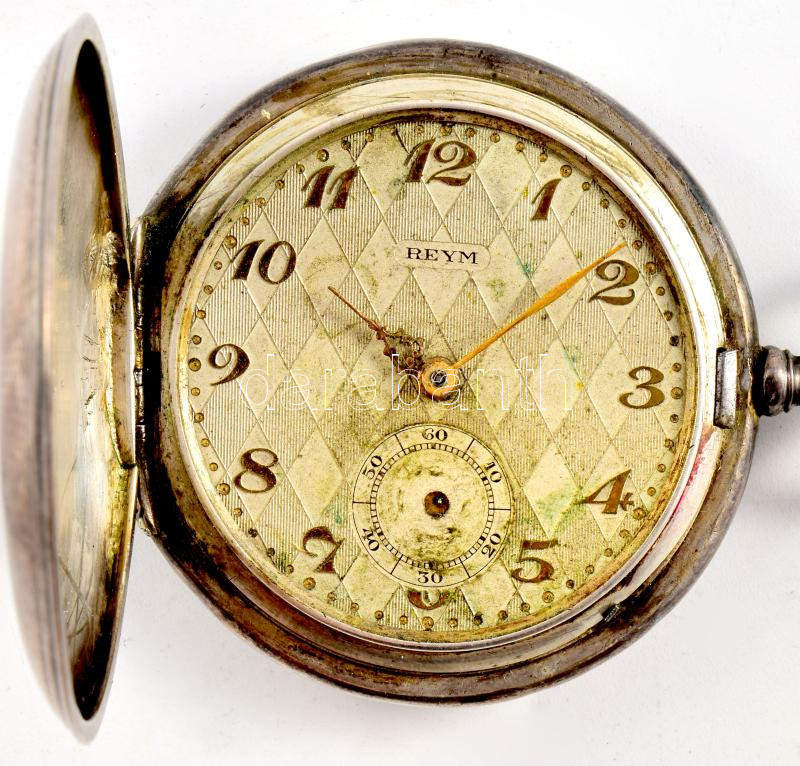 Reym ezüst (Ag) tokos zsebóra, hiányos, d: 4,5 cm, bruttó 61g https://www.darabanth.com/hu/514-Filatelia-kepeslap-numizmatika-mutargy-konyv-papirregiseg-ekszer-aukcio/515.0/Mutargy-papirregiseg-egyeb/Orak~88/Reym-ezust-Ag-tokos-zsebora-hianyos-d-4-5-cm-brutto-61g~II3435228