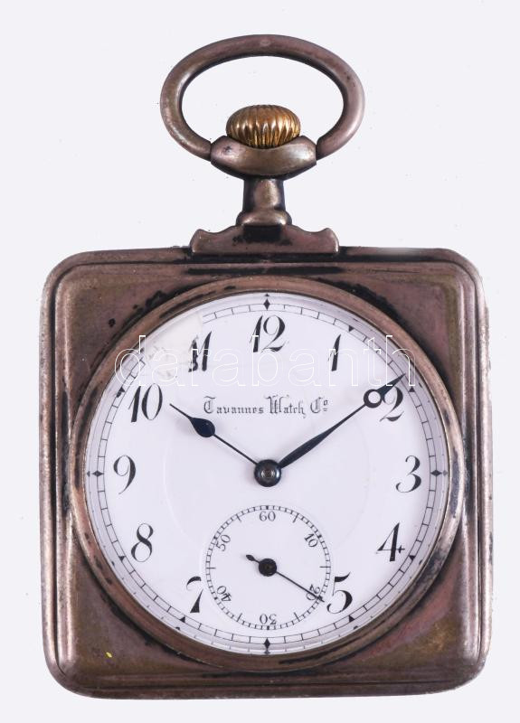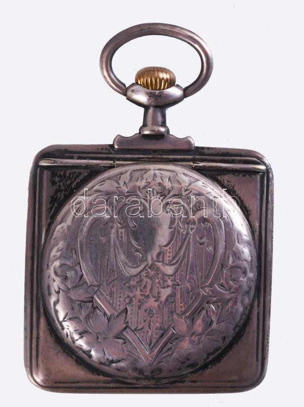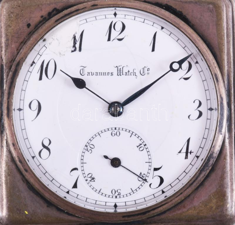 Leírás: Tavannes ezüst (Ag) zsebóra gilosált hátlappal, szögletes tokkal, számlap sérült, jelzett, 48x48 mm