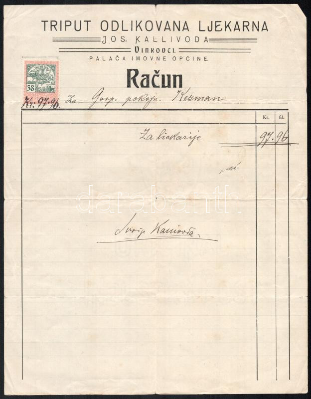 Leírás: cca 1900 Vinkovci, számla céges fejléces papíron, 38 fillér okmánybélyeggel, kisebb lapszéli szakadással
